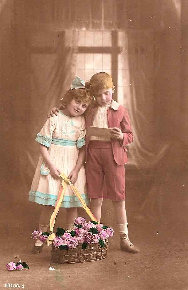 Another color we note being used in these potcards is pink. We note both pinl garments as well as pink being used in color derailing such as bows, straps, and socks. Now we have seen pink being used in the 19th century. We even note pink sailor suits. We think that modern gender conventions began to harden imn the early 20th century. Thus we do not think pink would have been very common for boys.