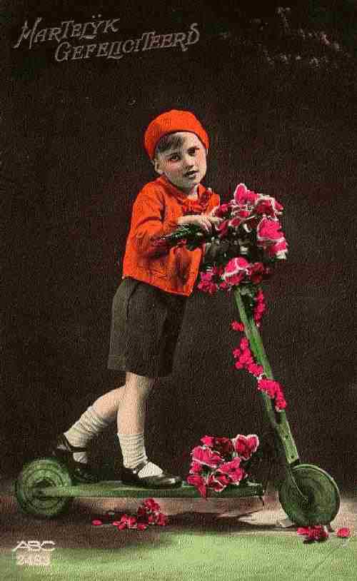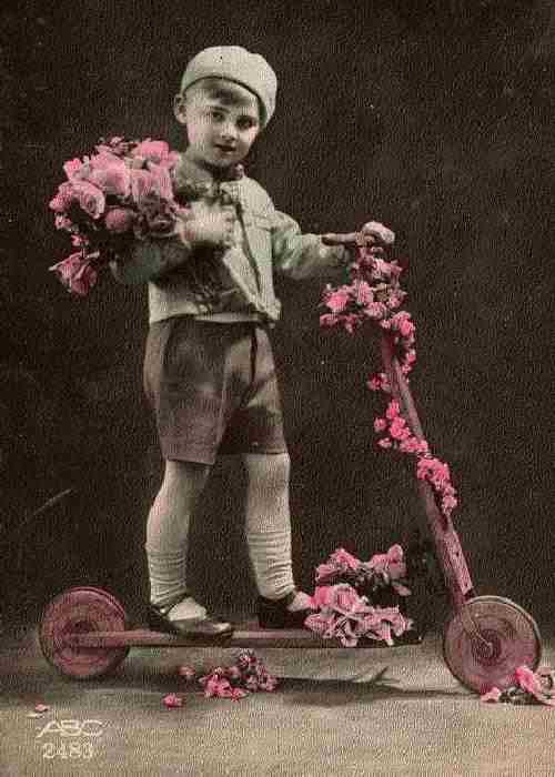 We note PC Paris cards in the early 20th century before World War I. Some of the cards were rather strangely posed such as little girl with a big wine bottle. Boys were commonly pictured with floweres. Sailor suits were a popular costume for the boys, sometimes with wide brimmed hats. PC Paris was still printing cards in the 1930s. Card in the early 1930s showed boys in short shorts, often with white kneesocks ans strap shoes. The curled mid-length hair cut was also popular.
