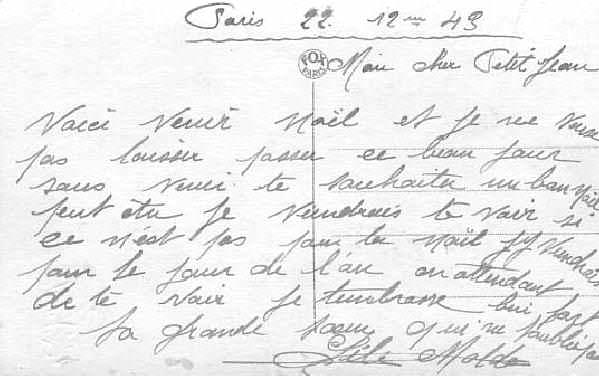 A big sister in Paris wrote to her little brother Jean on December 22, 1943. It was during the German occupation and conditions must have been beginning to detriorate at the time. The message sounds cheery. "Paris 12ème 43, Mai cher Petit Jean, Voici venir Noël et je ne veux pas laisser passer ce beau jour sans venir te souhaiter un bon Noël;