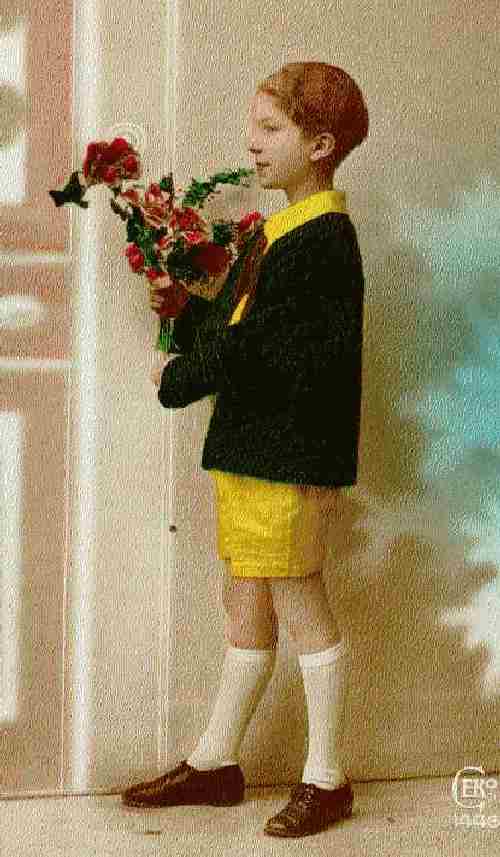 Post cards were most popular before color lithography had been perfected. As a result, most were based on black and white photograohs that has color painted on. The colors involved in the Dutch postcards are somewhat less fanciful than those seen in Belgium and France at the time, but we have also noted rather fanciful colors. We believe in fact that the colors may be some of the least reliable information from these cards. Some of the Dutch cards seem to have colors that boys may have actually worn. On the other hand, many of the color combinations also seem more artistic inventions rather than colors that older boys would have worn. Bright colors like yellow, orange, and red were probably not worn by school-age Dutch boys I am also not positive that the color combinations shown were the ones that would have actually been worn by a Dutch boy. Hopefully our Dutch readers will provide some insights here.