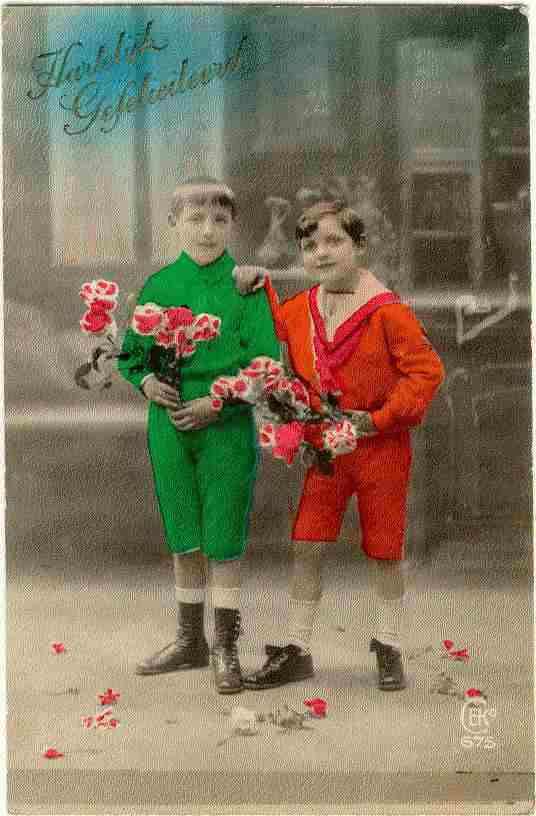 We have also noted rather fanciful colors. We believe in fact that the colors may be some of the least reliable information from these cards. Indeed some of the colorization makes no effort to be realistic, but simply pour on bright colors. Bright colors like yellow, orange, and red were probably not worn by school-age Dutch boys. Some of the colorization like the card on the previous page is very carefully done. We are doubtful, however, that boys in 1929 wore yellow short pants. Other images like the rather crudely ciolored orange and green postcard on this page are clearly fanciful.