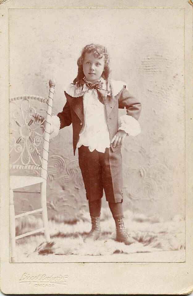 The photographic depictions in addition to the mount characteristics also provide a lot of useful clues. Some of the characteristics to assess or the background. The portraits for the 1860s CDVs were very plain, but by the late-1860s were beginning tgo be much more elaborate. The style of the depictions and scenes depicted varies sunstantially over time. Poses also varied. Single individuals standing in a largely uncluterd stage-like scene seem common for 1860s CDVs, but we do not commonly see cabinet cards posed like this. And there were differences in the furtniture. A basic gair and small fabric-vivered table was common for Daguerrotyoes and Ambrotypes from thge 1850s and 60s, but little scene in cabinet cards. We see a lot of upolkstered furniture with tassles hanging down in the 1870s and 80s. We are nor entirely sure about the dating. One more clearly defined type of furniture was whicker furniture which we begin to see about the turn-of-the 20th century. A good example of whicker furniture is an unidentified California boy in 1897. And we see Lawrence Ray Gard in 1904 with whicker furniture. Of course the clothing styles are also helpful in dating. But for our HBC website, we are primarily interested in using tge cards to date the fashion, so this is less helpful in helping to date the portraits.