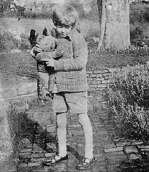 him William. This is a picture of A.A. Milne and Christopher (with a certain Mr. Edward Bear). Christophere was a literary character based on Milne's own son named Christopher. The Winnine the Poo books made Christopher the most famous English boy with a trddy. When Christopher began school, the books had made him so famous that he was teased by the other boys. It took him some time to come to terms with the situation. I'm not sure what happened to Christopher's actual cherished teddy. Christopher Milne died in 1996.