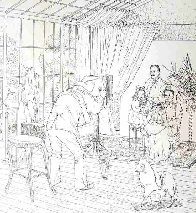 Figure 1.--This illustration shows a 19th century photographic studio. Notice the large window and skylight and absence of any flash. |