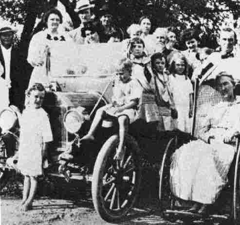 ![]() Figure 2.--Lyndon at left was photographed at a family picnic in 1912 when he was about 4. Lyndon is standing in front of the car. He wears a plain white tunic. Notice his long wavy curls. |
