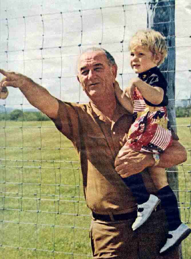 ![]() Figure 1.-- Here LBJ is holding his oldest grandson in 1971. The photograph was taken in LBJ State Park near the family ranch. Lyndon called Lyn looks to be wearing shortalls and white double t-strap sandals. A HPC reader writes, "I remember boys in my wife's family wearing these type shoes about this time. /i> |