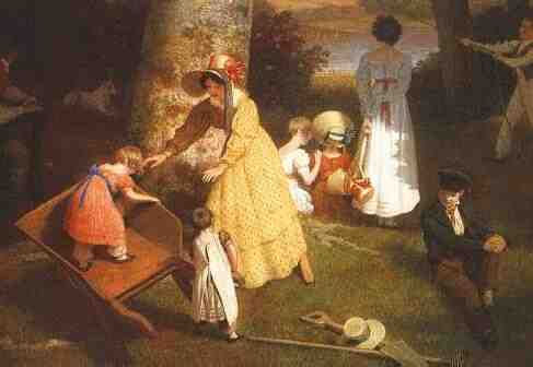 Figure 4.--I believe the two children playing around the wheelbarrow are boys. The long dresses the boys are wearing and the fact one wears a pinafore should help you date the image. |