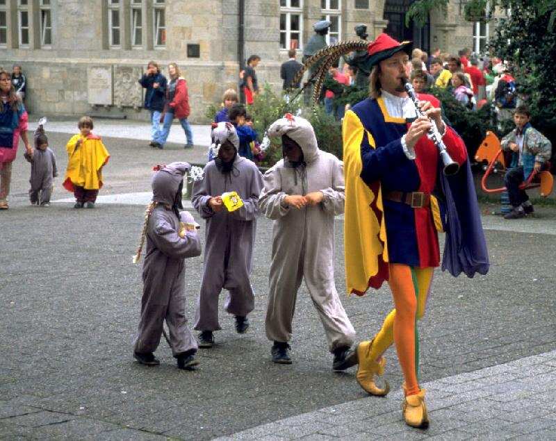 The town of Hamelin now recreates the legend and it becomes a favorite festival. A local flautist dresses up like a piper in a multi-coloured medieval costume, and the children dress up as rats to follow him. The photo here shows the festive recreation of the tale--children's literature brought to life with participation by the town children.