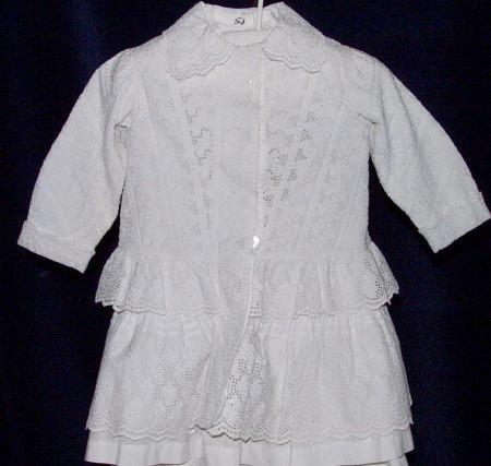 This garment is identified as a pelisse worn by a boy named James Somerville (1880s). We have no information on James. The garment is in the collection of the Cavalcade of History and Fashion. We are not entirely sure why this garment is described as a pelisse. The pelisse is a garment that is not well defined. We see quite a range of definitions. Examples are 'a long cloak or coat made of fur or lined or trimmed with fur'. We note fur is often associted wiyh a pelisse. This would makec sence as the pelise is often described as an outer garmen, either a coat or cloak. Another definitiion is a 'a woman's loose lightweight cloak with wide collar and fur trimming'. Many but not all definitions stress that it is a womnan's garment. One source describes pelisse as, 'any of a vaiety of long outer garments'. The garment here does not appear to us to be either long or a outergarment. It looks much more like a dress to us. Of course smaller versions, duch as this one here could be worn by girls and younger boys in the 19th century. The Museum tells us that, 'James Somerville’s pelisse of broidery anglaise from the early 1880s ... is an example of a male child’s dress which buttons up at the front.' This garment does not look like a cloak or coat at all to us, but rather like a dress. If it is an outer garment, it certain is a fancy one.