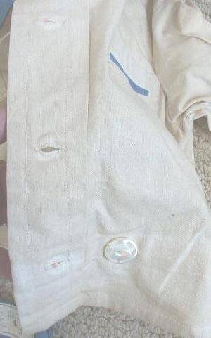 The button are all original and intact and appear to be a carved Mother of Pearl. The top and bottom attach by means of buttons. Trouser suspension is a problem for younger boys without defined waistlines. Belts were not commonly worn at the time. The button-on styling was very popular for American boys in the early 20th century, especially in the inter-war era. We note many European boys at this time wearing suspender shorts, but this was much less common in the United States. This item was for a 4-year old, but button-on clothing was commonly made for boys up to about 10 years old.