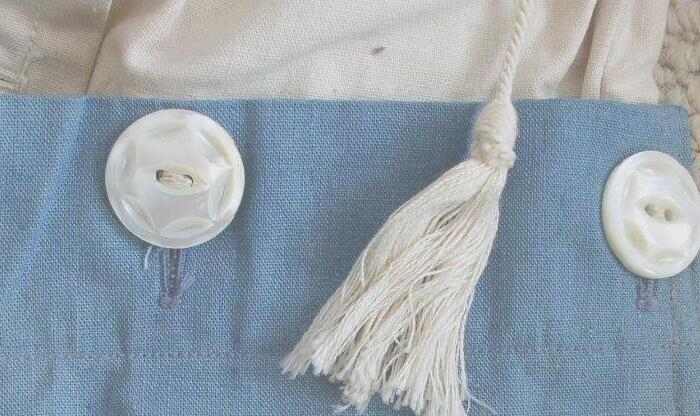 The outfit included color detailing on rhe white blouse as well as buttons on both the blouse and pants. The blouse breast pocket is detailed in blue color. Blouses in the early 20th century were often worn with bows. This was becoming less popular in the 1920s. This blouse had a kind of string tie wuth tassles. There is a a white cord or string with tasseled ends attached to at top button.