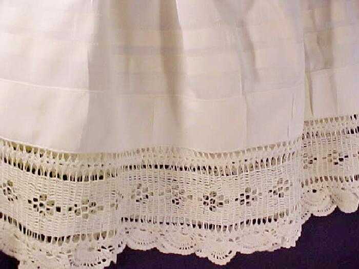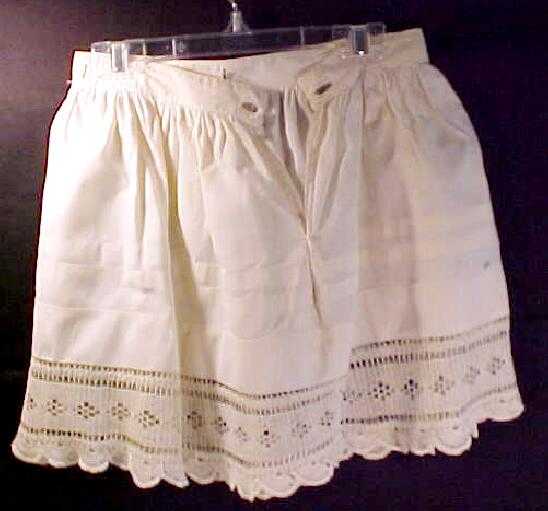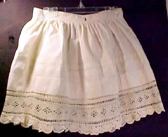 An example is a decorative half petticoat slip, probably dating to the late 19th century. The dealer describes it as, "This is really a lovely Victorian child's petticoat/slip of white cotton with crocheted lace and deep tucking around the bottom.It is from the late 1800s. It is for a younger child. The length from the waist to the bottom of the lace is 14". The lace border measures 4". There are button holes in the waistband which button to a garter or waist suit. This is a half petticoat. Full petticoats were made with boddices. piece.