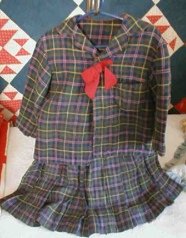 We asked the dealer hjow she was sure that it was a boy dress. She replied, "The style. Little boys dresses were were more simple ... if that makes sense. Many were pleated or straight skirted dresses ... not as feminine looking. Sailor collars were popular with boys although girls did wear them, too. Now, I do believe the baby & toddler both boy and girl wore pretty much the same dress but by about age 3 you can start to tell the difference in clothing between boys and girls." These vintage outfits are very helpful in showing fabric colors as all the photography at the time was done in black and white.