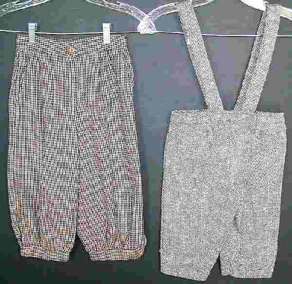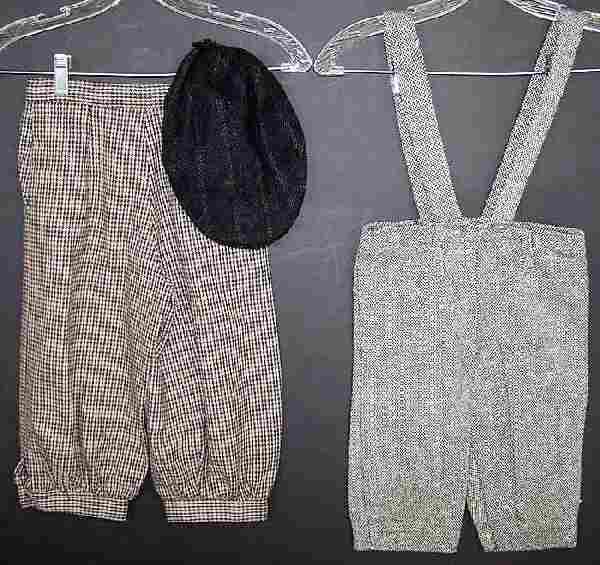 We note a of vintage American boy's wool knickers which we believe date to the 1920s. The lot was being sold at Moorpark, but we are not sure where that is. The lot included a pair of hounds tooth wool knickers with a button and zipper fly for closure. There are side pockets. They measure 23 inches long, with a 13 inch inseam and 22 inch waist. The second pair of pants are made of wool with suspender straps which can be removed. We have not noted a lot of suspender knickers so this is interesting. Note that the suspender staps buttoned on and could be removed. There are snaps for closure and a small back pocket. They measure 17 inches long, with a 10 inch inseam and a 24 inch waist. We assume they were probably worn by the same boy, presumably at different times as the sizes are slightly different. There was also a flat cap with these knickers, presumably worn by the same boy.
