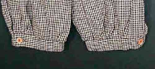 The second pair of pants are made of wool with suspender straps which can be removed. We have not noted a lot of suspender knickers so this is interesting. Actually after looking at the pants, they seem to be suspender short pants rather than knickers. There are no buttons or buclkes at the knee to close them. The tapopering, however, looks more like knickers. Note that the suspender staps buttoned on and could be removed. There are snaps for closure and a small back pocket. They measure 17 inches long, with a 10 inch inseam and a 24 inch waist. The buttons on the suspender pants look unusually small.