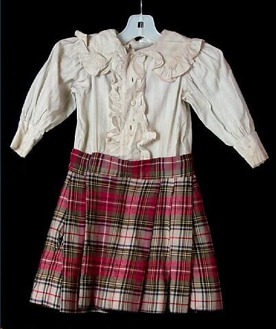 The kilt-skirt is done in red wool, with olive green, blue, and yellow plaid patterning. The kilt-skirt is pleated, but not with sharp pleats. The skirt extended to calf length. It closed at the right front and had button holes for the blouse waist buttons. The buttons are not shown in the image. We are not sure why.