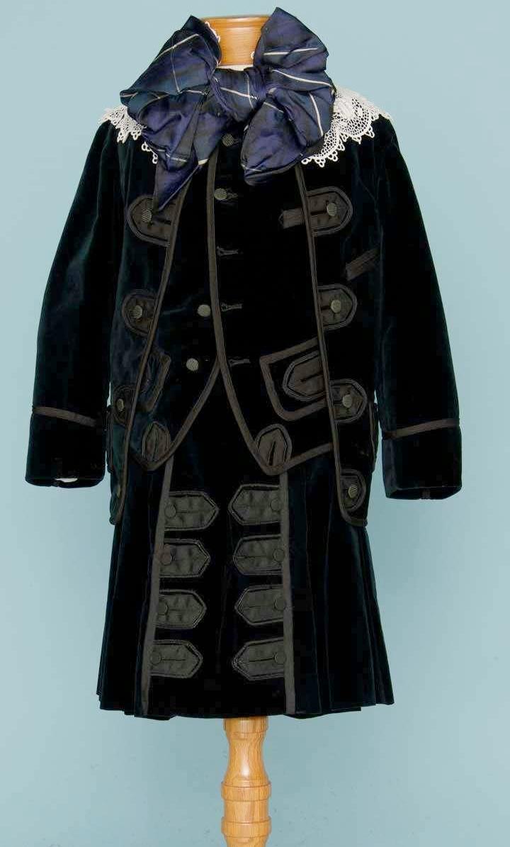 Here we see a black velvet kilt suit worn by Harris Whittemore Jr. in 1898. e see him pictured with Marie Cassat wearing the suit. Kilt suits were a popular outfit worn by younger American boys for half a century (1850-1900). It was a style that originated in Britain, reflecting Queen Victiria's love of Scotland. We see some after the turn of the 20th century, but not very many. Black was not very common for kilt suits. This one was done with grey piping and decoration. Harris would be the model for Marie Cassett's painting 'Boy wuth golden curls'. She would, howevr, paint him in a blue sailor outfit. Here we see the full suit showing the jacket with the floppy bow and lace collar along wih the vesr and kilt skirt (figure 1), but we also have images of the various other garments which help us understand the outfit in greater dertail. Looking at these garments, it us amazing the effort and exoense tghat went into formally dressing young boys.