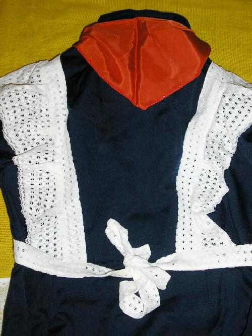 Sizes of uniform: length of the dress – 40.5 inch; dimensions dress from right to left shoulder – 17 inches; length of the arms – 23 inches. I'm not sure what size child that would have been. I don't think that there was a required cap, but girls often wore large white hair bows. The girl probably would have worn it with white kneesocks. I believe this same uniform was worn by both primary and secondary children.