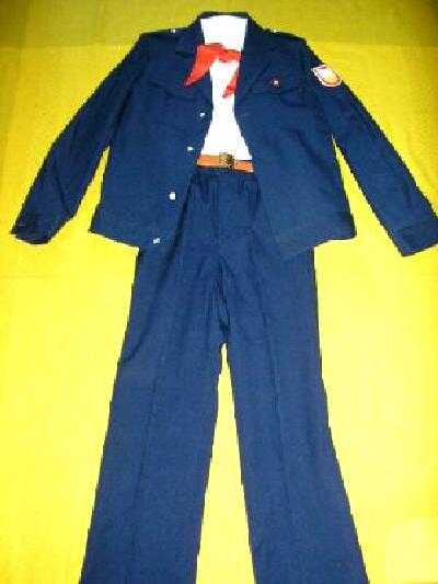 The everyday school uniform seen here was worn by a Soviet student in the 1980s. The uniform consists of a white long-sleeve shirt, a blue jacket, blue long trousers, a red pioneer neckerchief, and a Pioneer badge with Lenin’s portrait. As a whole, all these items were obligatory items required by the Soviet school system. The shirt is 100 percent cotton. The jacket is 30 percent wool. The neckerchief was 100 percent silk. Sizes of uniform: length of the jacket – 23.5 inches; dimensions jacket from right to left shoulder – 15 inches; length of the arms –24 inches. Length of the trousers – 37 inches; width of the waist – 26 inches. I'm not precisely sure what age boy would have worn this uniform. It would have to be at least a 4th year student because he was a Young Pioneer. The boy here als had a badge with a book and sun symbol on the left sleeve. I'm not sure what that represented.