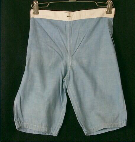 The pants were below-the-knee lknickers which had elastic leg closures. This helps to date the suit to the 1910s. Sailor suits in the 1910s were more likely to be short pants suits. The source reports that there are belt loop on each side of the knickers waist, although we do not see them. The white waistband had button holes. These were made for the garter waists boys wore wore at the time to old up pants and longstickings. A side seams was left open down to hips, with no closures.