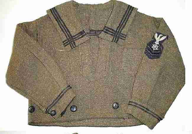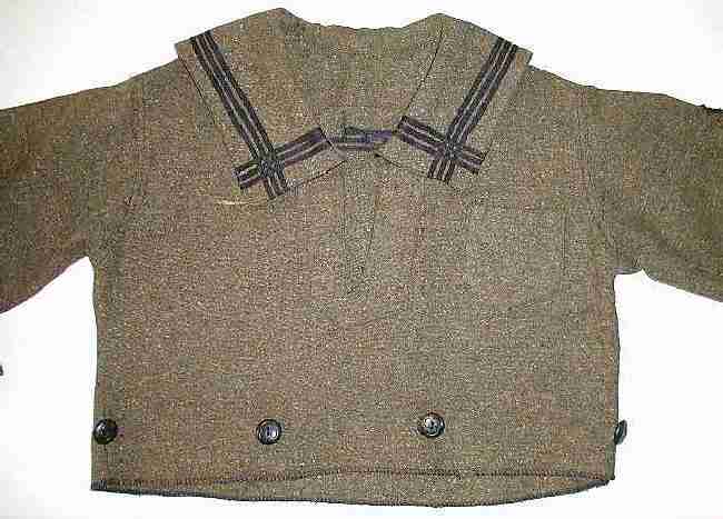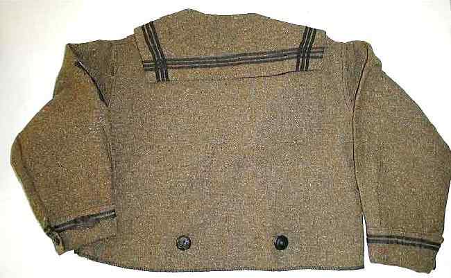 Here we see a brown button-on sailor suit from the World war I era. We usually think of sailor suits as white or blue. These were certainly the most common. We note, however, many other colors. In particular during the early 20th century there were suits made in various drab colors like grey and brown. These were play suits and the colors did not show dirt like a white suit did. This looks to be a World War I vintage child's wool sailor shirt. We date it gto the World War I era both because of the style of the rank emlem and the use of the brownish color. (This was an army color and as far as I know not actually used by the Navy. It is a brown tweedy light wool shirt with black braid trim around the sailor collar and front piece. The size is 13" long, 10" long underarm seam length and 29" at the waist. The 29" waist measurement seems large for the age of the boys wearing this outfit. (We are going by the source.) We would say that 20" seems more reasinable. I'm not sure about the age of the boy that would fit this suit, perhaps a 3-year old. There are buttons at the waist front and back to attach the matching pants (figure 1). Click on the image for a better view of the waist buttons. This sailor suit didn't have the traditional "V" front, but there was a back flap with matching braid work (figure 2). The flap seems rather small compared to some we have seen. There almost certainly were matching pants to button on to the shirt. I'm not sure as to what kind of pants. They could have been either short or long pants. I think short pants or knee pants were more common in the button-on style, but this looks like a Fall-Winter seasonal suit given the material. I'm also not sure if it came with a cap. We have a photograph of two brothers wearing similar button-on sailor suits.