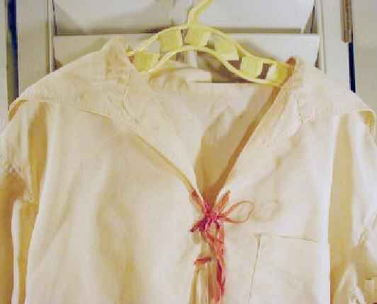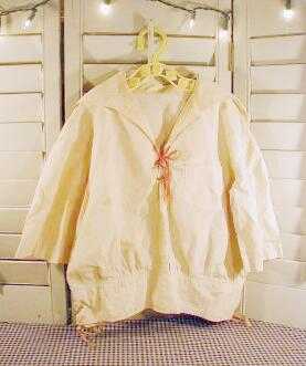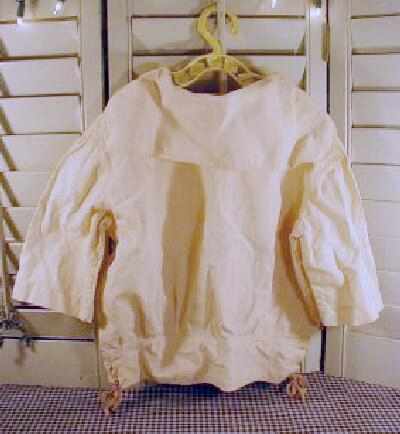 Here we have another white American middy blouse. It is all white without any detailing. This one is intersing because you can see how a draw string cretate the blousing effect seen in manu period portraits. The blouse is undated, but probably dated to the 1920s. The dealer describes it as, "A wonderful vintage sailor-type child's shirt. The shirt appears to be a small child size and measures 14" across the shoulders and 16" from collar to hem. It laces at the front collar and also on each side at the bottom. The back has the familiar sailor collar flap that is ready to sail. The color is a nice antique deep ivory with some tea-type stains which adds to the vintage charm."
