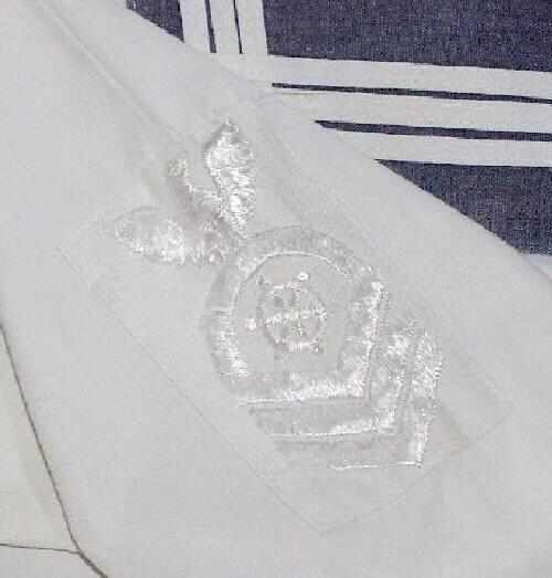 This middy blouse came from a New England estate sale. It is a vintage white middy blouse with traditional styling . We are unsure about the date this garment was made, but would guess the 1940s. It could have been worn by a boy or girl, but it seems to me a younger boy would have been more likely to wear a middy blouse in the 1940s. The fabric feels like a nice quality linen or cotton twill, the dealer was unsure. It is an off-white in color with washed navy blue at the collar and sleeves, with a triple stripe detail. There is an embroidered patch on one arm with a ship’s wheel, three downward stripes, and an eagle. One small coin pocket. The triangular piece at the neck is removable, and attached by two buttons. This garment looks to be homemade. We believe that the size was an age 6. It measures: 15” across the chest. 12 ˝ “ sleeve. 17” long.