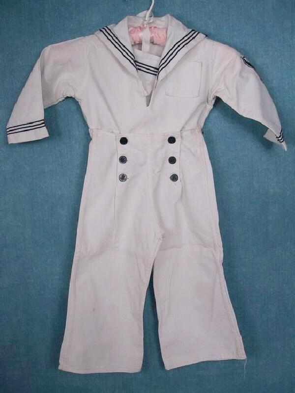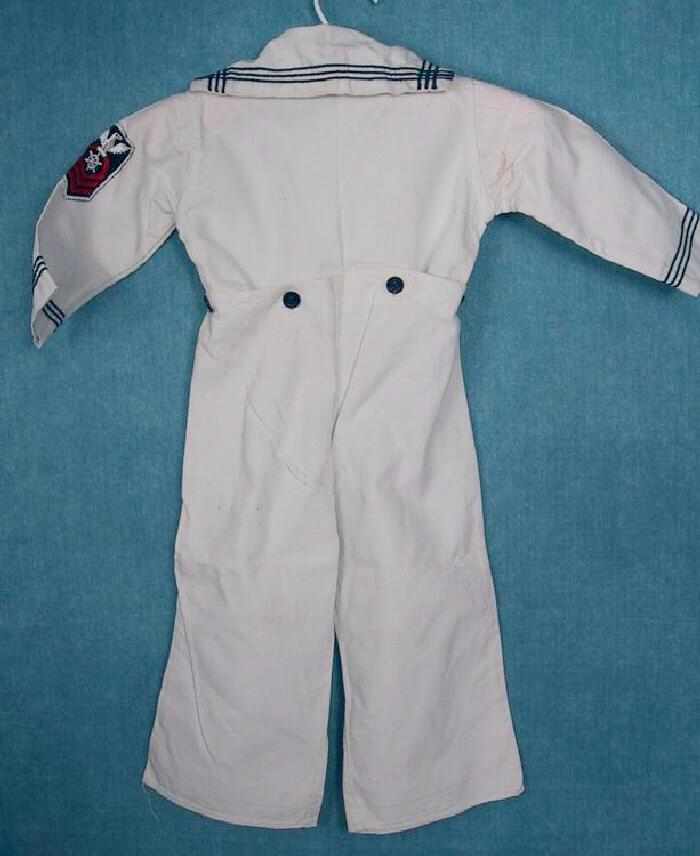 This is a vintage 1940s childs sailor suit. It is a white suit setailed with the traditional three stripes. The suit is about 27 1/2" long from shoulder to bottom of pants (size 2, 3 or 4?-unsure of size). We assume that it was a World War II era suit. Sailor suits were stillworn at the time, but normally by younger children. You might see a few of the younger boys in primary school wearing them. This suit is for a pre-school boy. It's made of a heavy canvas-like fabric that I think the actual uniforms were made of.