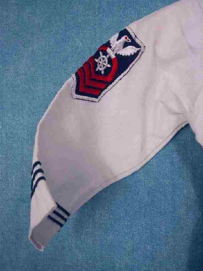 The pants themselves are about 20" long with 10 navy blue anchor buttons holding the pants onto the shirt (6 in the front, 2 at the sides and 2 at the back). The shirt is about 8 1/2" long, with 10" sleeves (and sewn on patch) front pocket and it's about 10 1/4" from shoulder to shoulder. The pants look to have a slight bell-bottom flair. There are no labels, but it looks to be professionally done and finished off. There is also an embrodiered petty officer rank ensignia on the sleeve.