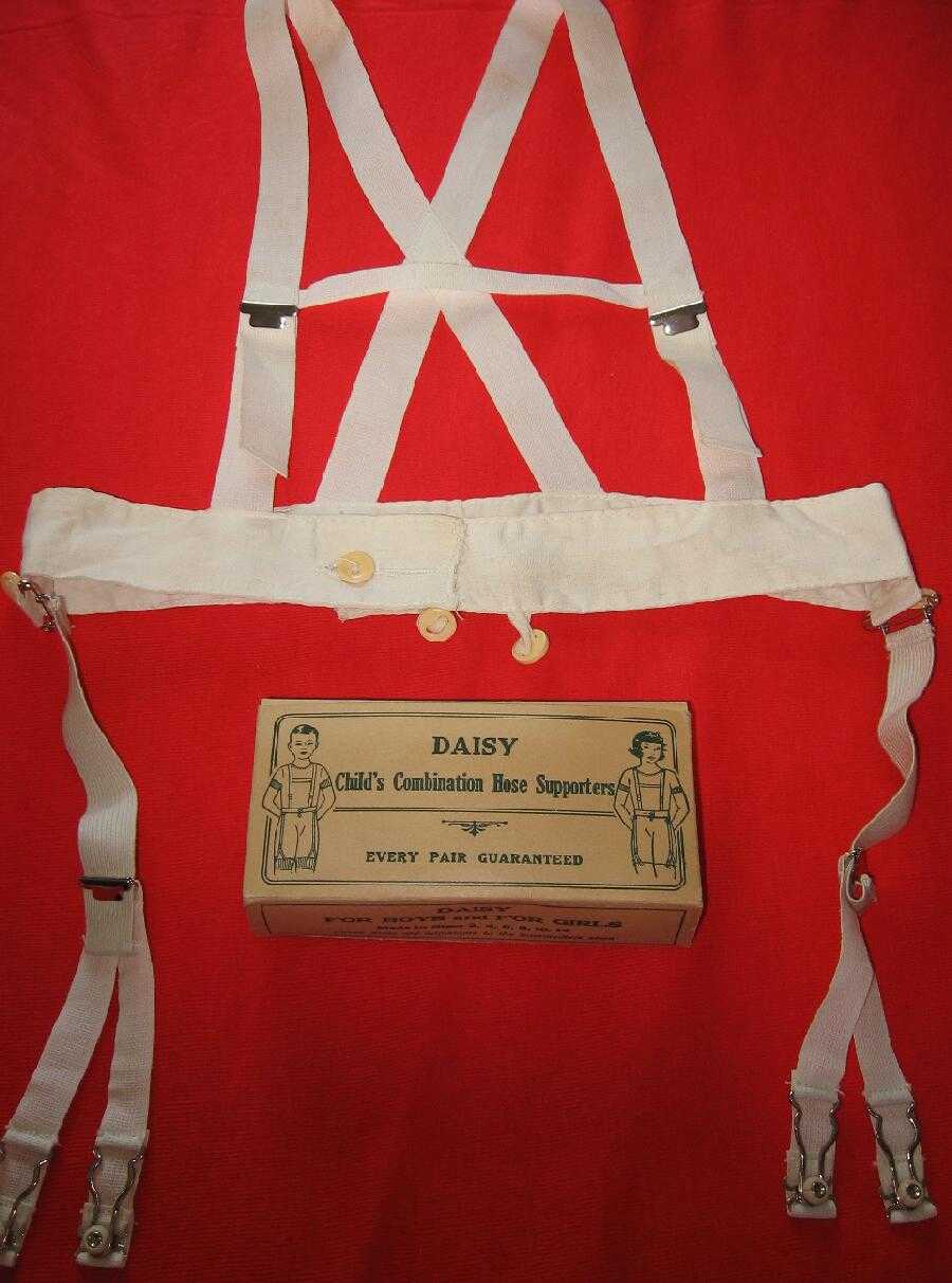 This vintage garter waist, probably dateing from the 1930s, is the typical Dr. Parker style of hose supporter. It was made for both boys and girls up to the age of 14 years. It consisted of suspender straps with a cross strap across the chest to keep the shoulder straps from slipping. The waist band fastened in front and had additional taped buttons for attaching to short trousers or skirts or (for girls) bloomers. There are metal pinning tubes at the sides to which a pair of double-pendant hose supporters are attached for long stockings. The model is referred to as "Daisy", used by the Kern's Manufacturing Company in Mattoon, Illinois, where children's hose supporters were made. They sub-contracted to Sears Roebuck who advertised 'Daisy' garter waists for boys and girls in their late-1930s and early-1940s catalogues.