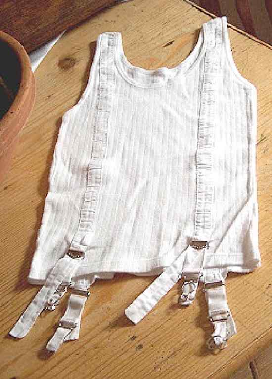 another person had to help in dressing and undressing. For elder children, say 8 years up, the button row was in front, so that the child was able to do it by himself/herself. I am not sure whether we really see the front of the "Leibchen. The ribbons where the buckles and straps are attached which one sees are longer than those behind. On the back of the body the buckles and straps necessarily had to be longer. I myself never had such a commercial product for holding up my long stockings in winter. My mother used button-hole attachment. My "Leibchen" wwere crocheted by my mother, grandmother or an aunt. During the war-time and after the war it was possible to reuse the yarn to remade a bigger one for the next winter when I had grown a bit."