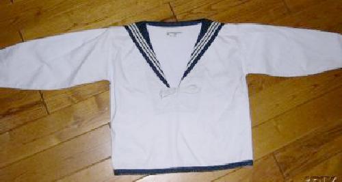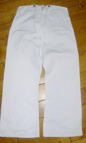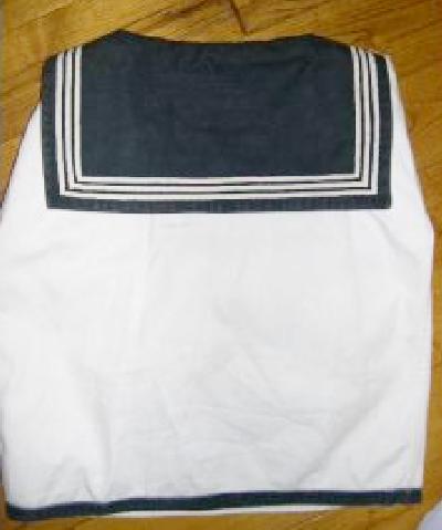 This English boys' sailor suit is reportedly old, but we have no idea as to when it was made. It was sold in Selfridges, a major London department store. The label probably can be used to identify the age. It is a white with blue trim long pants sailor suit. The size is 28" on the trousers. The middy blouse is 17.5" in length, arms are 15".