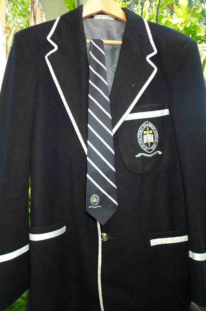 An Australian reader has provided us some images of Australian scgool garments. They of course show a British influence. One of the most destinctive item was the school blazer done in a wide range of colors. These blazers were once commonly worn, but by the 1980s were mostly worn at private schools. The blazer here is from Pulteney Grammar school (figure 1). It is a black blazer with white braiding to the edges and pockets. The Christian Brothers College has a very similar blazer, only done in purple rather than in black. Notice the destinctive badges. Schools once had matching caps but were gradually discontinued, probably in the 1970s. Some private schools retained them for the younger boys.