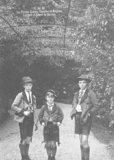 I do not know if Charles and his brother wore Belgian folk costumes. Somehow I rather doubt it. They did wear Bavarian folk costumes when visiting their Bavarian cousins. One photograph shows both Charles with his Bavarian cousins, Luitpold and Albrecht. The boys wear Alpine caps, Bavarian jackets, and lederhosen. The photograph here is one of the few available snapshots of Charles. All the other photographs appear to be rather formal studio portraits. We assume that Prince Leopold also visited with his Bavarian cousins and wore similar folk outfits. There are many images showing the Bavarian princes wearing folk outfits like these. This image shows the close family relationship between the two families, as Queen Elizabeth was a Bavarain royal, and it is not surprising that many of the outfits worn by these boys were so similar. We only seeing Charles wearing this folk outfit in Bavaria. Apparently he did not take it home and wear it. Perhaps that would not have been politically correct for a Belgian prince to be seen wearing German folk costumes--even before Germany invaded neutral Belgium in 1914 launching World War I.