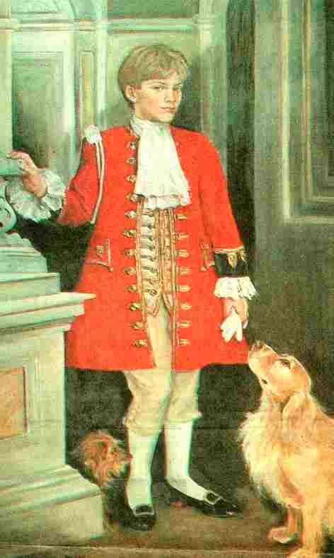 England's Earl Percy, at the time a 14-year old schoolboy at Eton, was discussed in the English tabloids in 1999 (figure 1). His father has gone to court in an effort to delay his son's inheiratance. Earl Percy is the eldest son of the 12th Duke of Nothumberland who was to have received £0.25 million a year from his $13.50 million Albury Estate in Surrey when he turned 18 years old. His mother and father, the Duke and Duchess of Northumberland thought that it would be reckless to give a youth so much money at that age. They told the court that their son would be exposed to spongers and reminded them of Marqquess of Bristol who inherited £1 million at 18 in 1999 a drug adict at 44. They also mentioned Earl Percy's Uncle, the flamboyant 11th Duke of Northumberland who died of an overdose of amphetamines in 1995. His parents did not think that he was an irresponsible boy, and described his as a clever, hard working boy. His father asured him that he would be supplied with reasonable funds that he can sensibly use. The Earl's costume includes a long red coat with gold trim, jabots, knee pants, white stockings, and buckle shoes. HBC is unsure what costume this is based on, but it looks like late-18th century dress--perhaps from the court of George III. Why this has become the standard costume for royal pages, HBC is unsure. A British reader writes, "The shoes that the young "earl" is wearing are the very same shoes which the Lord Mayor wears on court occasions. I have a pair purchased in the UK made by Ede & Ravenscroft of London. The shoes are a black patent leather pump with a highly delighted ornament (sort of like a brooch) instead of a bow. It is my belief that shoes such as these are worn by many Lords or peers of the realm when in fancy dress."