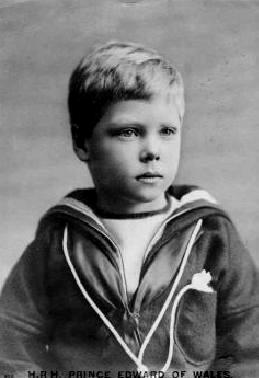 David by age 5 was wearing very smart short panted sailor suits with ankle socks. There are a lot of pictures of the future Edward VIII and his brother in matching sailor suits and broad-brimmed hats, often with their sister Mary wearing a sailor suit (with skirt) or a smock. Sailor suits and kilts were the only clothes his father felt appropriate for boys. Note that the sailor suits chosen for the boys are the classic ones looking very much like the uniforms of actual seamen. One exception is that the outfits worn with short pants often have vertical stripes on the shorts. I'm not sure what the origin of this style was. Notably David's uncle, Albert Victor also had vertical stripes on the pants of his kneepants. Sailor suits and kilts were the only clothes his father felt appropriate for boys. David says that he and his brothers and sisters were always "on parade". His father would never let his children forget that. David says, "If we appeared before him with our Navy lanyards afraction of an inch out of place ... there would be an outburst worthy of the quarter-deck of a warship."