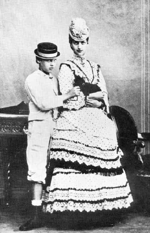 Prince George's relationship with his mother was especially close and mutually affectionate. She was much more involved in her children's lives than many women of her time and station. Presumably the bond between her and George was tightened by George's lively resonse in kind that her older son Albert Victor (Eddy) was incapable of giving. (Prince Eddy was his grandmother Queen Victoria's favorite, primarily because he was too lethargic as a child to cause any trouble, this changed when he grew up.) It is strange how a boy like George who was so tenderly treated as a child could have been so severe and strict with his own children as a father. He was her favorite child and he was devoted to her. The letters between them make strange reading today, but the tone was more common for the time. Queen Alexandra had her papers destroyed, but Prince George saved most of her letters to him and some of his letters survive to demonstrate that he wrote back in the same intimate tone. These letters are very different from the much more formal letters Queen Victoria wrote to her children which can sound more like a letter frm the Queen than from a mother.