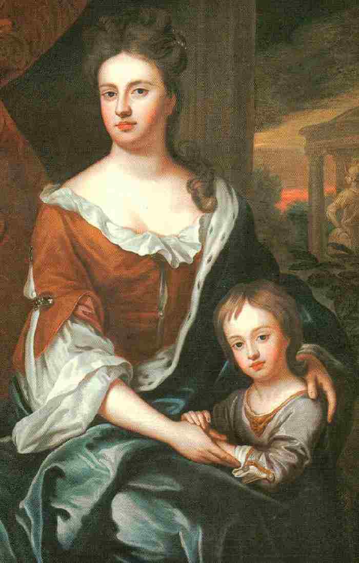 Daughter (1694- ), Daughter (1695- ), Son (1696- ), Twins (1697- ), Son (1697- ), Son (1698- ), and Daughter (1700-1700). The portrait here shows Anne with Prince William (figure 1). He looks healthy in the portrait. William was styled Duke of Gloucester, but died July 29, 1790 before the great seal was put to his patent.