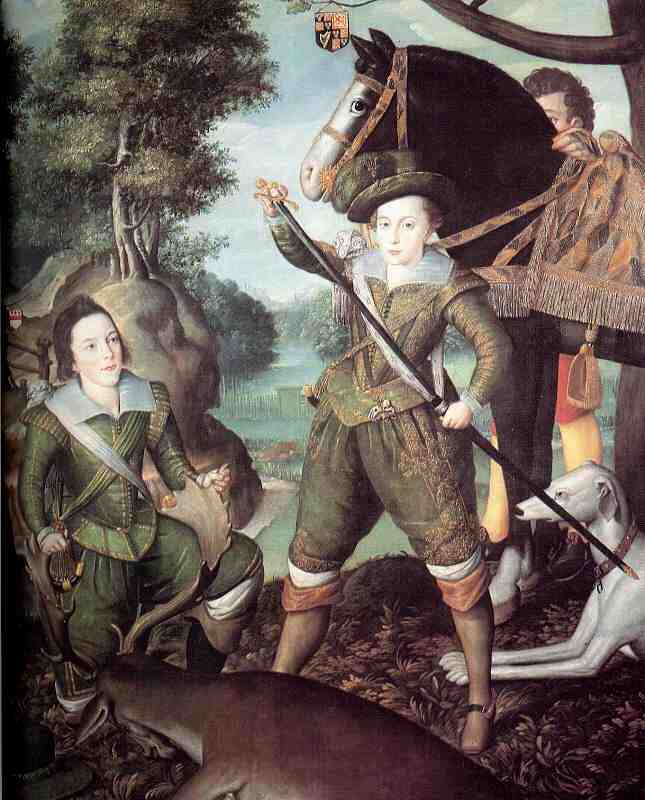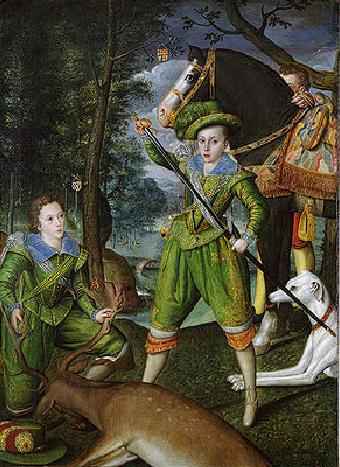 Prince Henry is seen here as a boy with his friend Sir John Harington who looks a little older. A groom stands behind the horse. Prince Henry would have been about 7 years. One wonders if a 7-year old boy would have been allowed to charge around the countryside hunting deer, especially the heir to the throne. There are no weapons visible. Perhaps the dogs did the hunting and the sword delivered the coup de grace. Notice the elaborate embroidery on the suit. Also the boys' collars are wide, but very plain. Quite different than the elaborate ruffs so popular in the 16th century. Peake's royal hunting portrait seems to be modeled after an earlier style popular in the Netherlands and Germany. Prince Henry is seen sheathing his sword. His hunting companion, Sir John Harington, holds the deer's antlers. The light palette of colors aswell as the rather decorative look are good examples of Peake's style. We note a range of postings on the internet showing differnt shades of this portrait. We are not sure which is the most accurate.