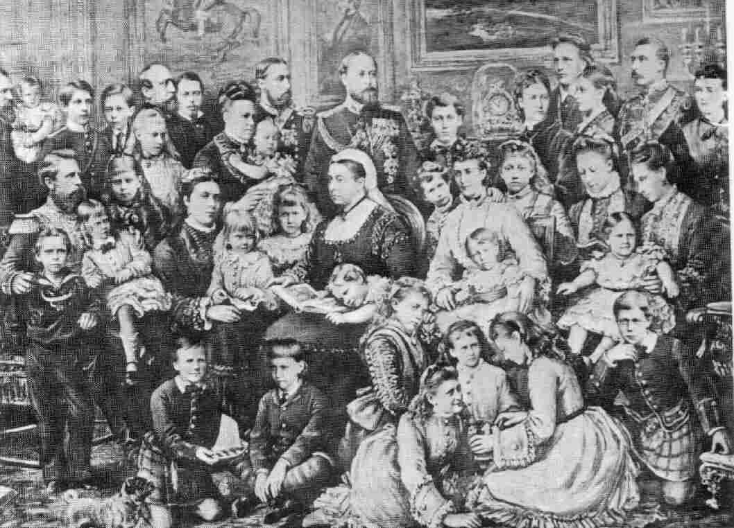 This portrait was taken in 1872, about 10 years after Albert passed away. Most of the Queen's family is now married and have children. I'm not sure what the occassion was. We can identify some, but not all of the individuals. The easiest way of addressing the question is to identify Victoria's childre. Their spouses and children are grouped around them. I'm less sure about the children knealing down in front. Do let us know if you can identify any of the individuals.