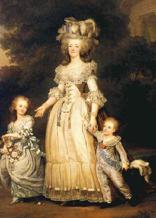 Figure 1.--This painting shows Marie Antoinette with two of her children which I believe are her two oldest children, Marie Therese and Louis-Joseph. The portrait looks to have been painted about 1785 before the Revolution. He would have been about 4 years old. Note that he has already been breeched and wears a long pants sleleton suit. Also note his short hair. The artist was Elisabeth Vigee le Brun. . |