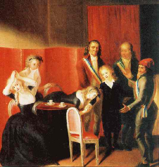 Figure 1.--This is one view of Louis-Charles's separation from his mother. Here his sister is shown as hanging on to him, but she too was also separated from her mother. Usually Louis Charles is depicted as wearing a long pants skeleton suit, nbut here he wears knee breeches. Norice the jailers wear long pants. We do not know when this image was painted or who the artist was. |