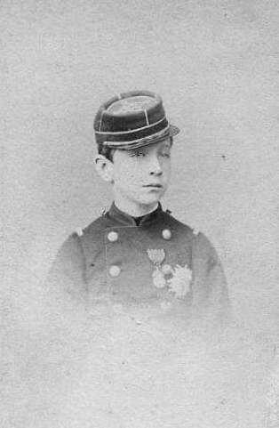 We also notice him wearing a French Army uniform as a boy. He looks to be about 10-11 years old which would mean about 1866. American will note the similarity to Civil war uniforms. We are not sure under what circumstances he would wear it, perhaps for state occassions (figure 1). He wears the cap cocked to the side in a jaunty way. One winders if this was his idea or perhaps his parents or the photographer.