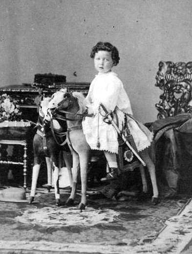 We see the prince wearing white dresses as a toddler. One portrait shows him on a toy horse when he was 2 years old (about 1858). It is difficult to tell, but the dress seems to have a matching jacket (figure 1). Presumably he was too young for a rocking horse. We note another portrait of him still wearing a a white dress (about 1859). A reader writes, "My understanding about white dresses for youngsters from a visit to Sturbridge village is that white was easiest to clean. You could bleach out most stains whereas colors were much harder to remove stains without damaging the color until fast colors (washing safe or non bleeding dies) were invented. So, applying that information to this situation, which may not apply, it is likely that white was often worn." The short sleeved dress has ribbons on the shoulders. It is interesting to note how common white dresses appear to have been for boys in old photographs. HBRC assumes that this was likely to have been in part due to the fact that the children were dressed up in their best dress for formal photographs. Surely they did not wear white dresses for every day. But given he was the Press Imperial, practial concerns presumably did not apply. We are not sure just when he was breeched, probably when he was about 4 years old (about 1860). We are still trying to determine this more specifically.