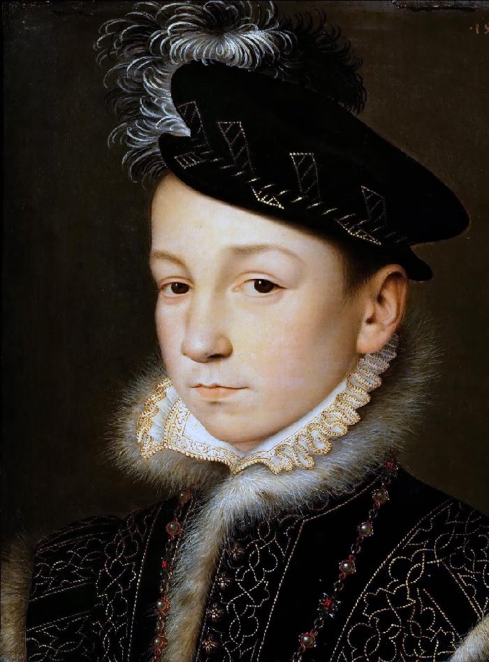 Charles was styled at birth Duke of Angoulême. He was created Duke of Orléans after the death of another older brother Louis, his parents' second son who died (1550). He and his silings, The royal children. were raised under the supervision of the governor and governess of the royal children, Claude d'Urfé and Françoise d'Humières, under the supervision of Diane de Poitiers. His father died unexpectedly (1559). He was only 40 yers old. He was injured in a jousting tournamenbt and his wounds festered. He was succeeded by Charless elder brother, King Francis II. Francis's had only a brief rule. As a result, 10-year old Charles was proclaimed king (1560). All of this of course mnust have had a huge impact on his childhood and relations with hus mother. When Francis II died, the Privy Council appointed his mother, Catherine de' Medici, as governor of France conveying sweeping powers. She acted as regent for Charles. The instability resulting from the ineffectual rule reigns of the three brothers (Francis II, Charles IX, and Henry III) was a factor in the wars of religion.