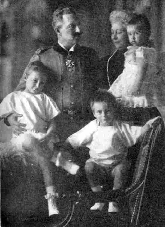Figure 1--This portrait shows the Kaiser and Kaiserina with three of their grand children in 1910. The children are Wilhelm, Louis Ferdinand, and Hubertus. The princes were frequently photographed in these play suits. Here they would have been 4, 3, and 1 years old. Wilhelm looks like he might have been 5 years old or almost 5. |