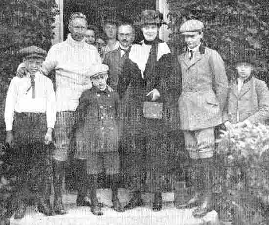 Figure 2--The former Crown Prince and his wife are seen here in 1920 with four of his sons (Wilhelm, Louis Ferdinand, Hubertus, and Federick). The boys wear various outfits with kneeoants and knickers. Their father also wears knickers. Notice the flat caps and Tyrolean cap. |