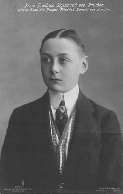 The available postcard image claerly identifies Prince Friederich Sigismund von Prussen (Prussia) as the eldest son of Prince Leopold von Prussen. The problem is that we are not quite sure who Prince Leopold von Prussen is. We have found several sons, grandsons, and nephews of William II named Frederich, but none with the added name of Sigismund or Leopold. Thus we are mot ye sure how he fits into the royal family. The available image shows him at about 12 years of age weating a suit with a large slightly rounded stiiff collar and some sort of necktie. He seems to be wearing a sweater unfer his suit jacket. His hair is slicked back with a sharp center part. Any leads readers can offer as to the realtionshop with the royal family would be most appreciated. The image is undated, but we would guess that the portrait was taken about 1910.