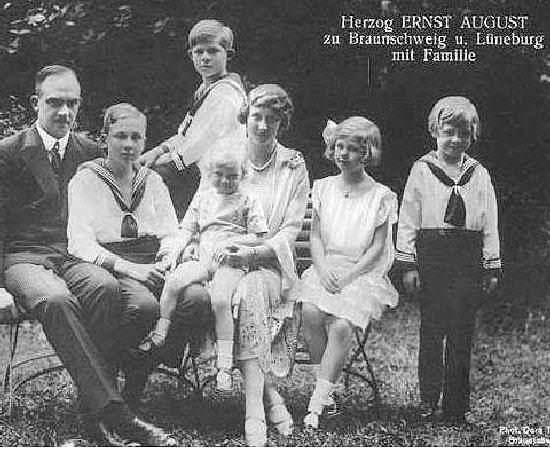 Ernest Augustus was the oldest boy of Victoria Louise and Ernst August. He was born in 1914. His christening was notable (summer 1914). The gathering of royalty was the last great gathering of European monarchs. The royals were connected by multiple family ties. The Prince had an particularly illustrious list of godparents, including the German Emperor and Empress (his maternal grandparents), the Duke and Duchess of Cumberland, his paternal grandparents (George V of the United Kingdom, Franz Joseph of Austria-Hungary, Nicholas II of Russia, Ludwig III of Bavaria, Frederick Francis IV, Grand Duke of Mecklenburg-Schwerin, Prince Adalbert of Prussia, Prince Oskar of Prussia, Prince Maximilian of Baden, and The 1st Royal Bavarian Heavy Cavalry Regiment. Within weeks World War I would erupt and these monarchsould be at war wuth each other. Many of thei thrones would be lost by the end of the War. The Tsar and his family would be shot. Ernest Augustus lost his titles when his father abdicated in 1918 when he was 4 years old. He was also heir to the British title of Duke of Cumberland and Teviotdale. The outbreak of World War I created a breach between the British Royal Family and its Hanoverian cousins. The British susspended this under the Titles Deprivation Act 1917. Unlike the three younger childrem, he did not join the Hitler Youth. He was too old when the NAZIs seized power (1933). The Gestapo arrested him (1944). I'm not sure what the circumstances were. I am not sure if he was actually involved in anti-NAZI activities or this was part of the the general NAZI anti-Hohenzollern feeling. Hopefully readers will have more details. After his father's death in 1953, he became head of the House of Hanover--Duke of Brunswig-Lüneburg.