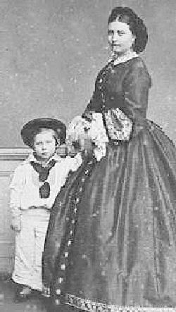 We notice Wilhelm at a very young age wearing sailor suits. The first portrait we know of shows Wilhelm at about age 2, probably in 1861 wearing what looks like a knickers sailor suit with stripped stockings. This shows that Wilhelm was breached at a very young age. We note another portrait of Wilhelm about 4-5 years of age wearing a plain long pants sailor suit without detiling and a large saucer-type sailor cap (figure 1). He is with his mother and would have been about 1863-64. The sailor suit Prince Wilhelm wears looks rather like the sailor suit his Uncle Bertie wore in the famous Winterhalter portrait.